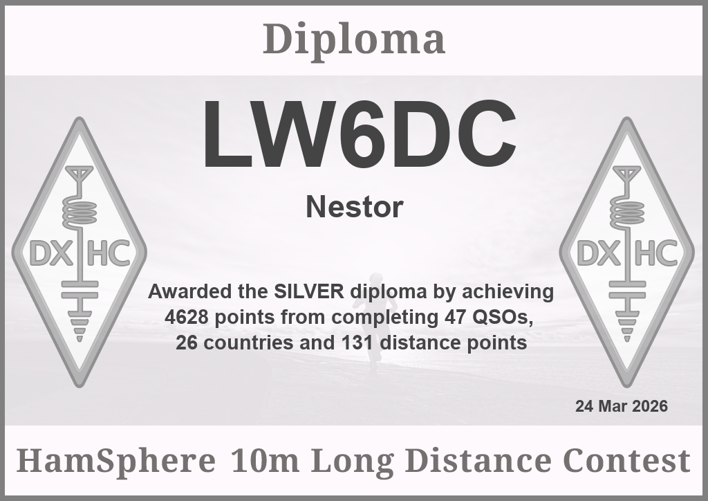 | HamSphere 10m long distance contest 2024 | 2024-11-09 10:00:00 | 2024-11-10 10:00:00 | 2024-11-12 00:00:00 | VIEW | ||||